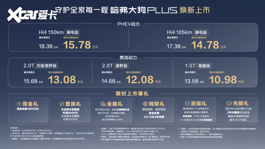 哈弗大狗PLUS于9月15日正式上市,燃油版起价格10.98万元,Hi4版别起价格14.78万元。尽管主张零价格与成都车展预价格彻底相同,但所谓的限时优惠价一点点没有悬念地少了3000元。该限时至10月31日,但11月的价格想必不会更高。
