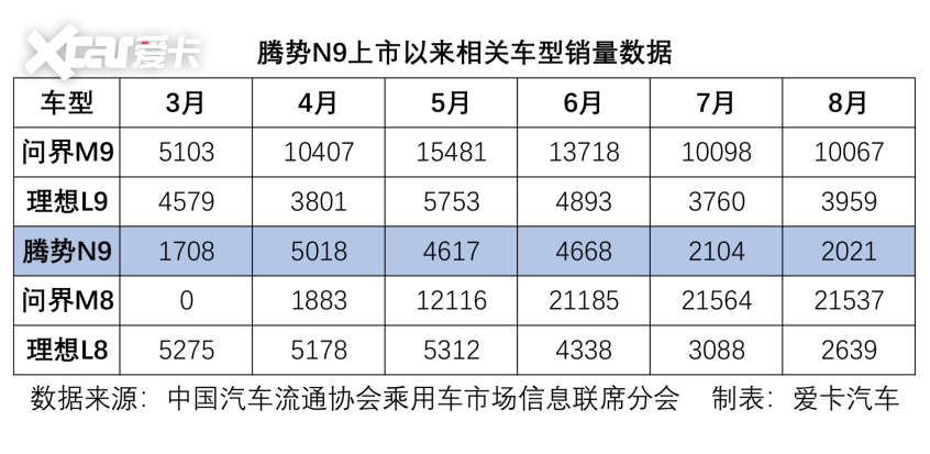 据中国汽车流转协会乘用车商场信息联席分会的多个方面数据显现,在随后的5月份,腾势N9的销量微降至4617辆,6月小幅回调至4668辆,虽比不上问界 M9、M8“月销过万” 的迸发节奏,但和抱负L9、L8能够等量齐观。来到下半年除了问界M8,刚刚提及的车型销量都有所下滑。其间腾势N9的7、8月销量为2104辆、2021量,环比下滑超50%。